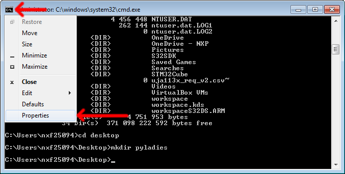 Aktuální adresář se dá změnit pomocí příkazu cd (z angl. change directory – změnit adresář). Za cd se píše jméno adresáře, kam chceme přejít. Pokud máš adresář Desktop nebo Plocha, přejdi tam. Pak nezapomeň ověřit, že jsi na správném místě.