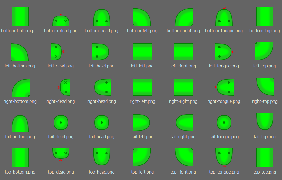 Na koncích hada je ve jménech obrázků místo směru tail pro ocas a head pro hlavu.