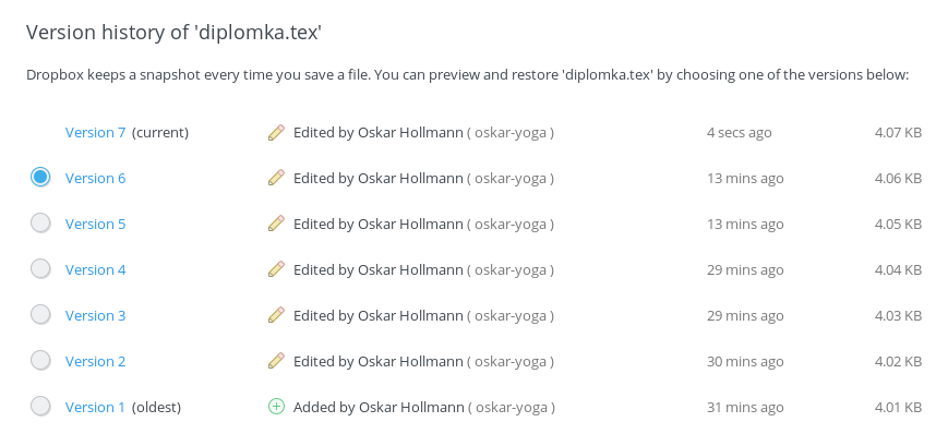 Část těchto problémů řeší nástroje jako Dropbox či Google Drive, se kterými ses možná již setkal/a. Tam můžeš například sdílet svůj dokument s dalšími lidmi nebo se můžeš vrátit k dřívější verzi dokumentu, když něco pokazíš a nemůžeš si vzpomenout, jak to bylo předtím. Příklad toho, jak to může vypadat, je zde: