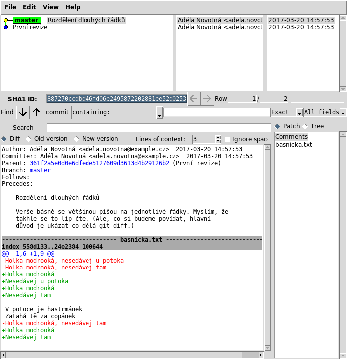 Změnilo-li se na řádku jen jedno slovo nebo i písmeno, celý řádek se ukáže jako smazaný a zase přidaný. Dá se to nastavit i jinak, když je potřeba, ale je dobré si na tento standard zvyknout.